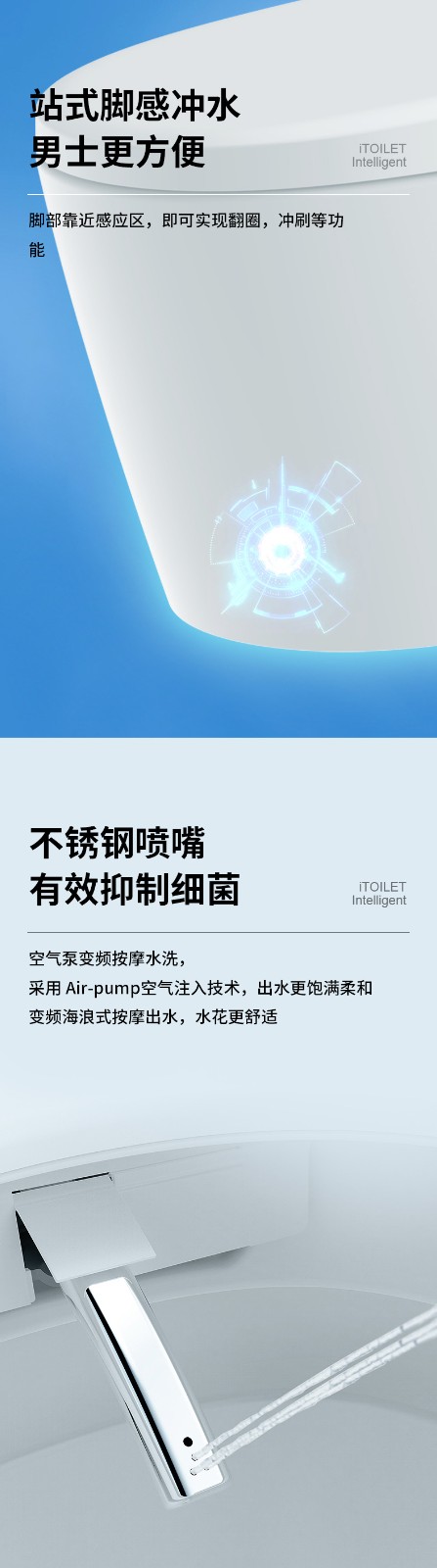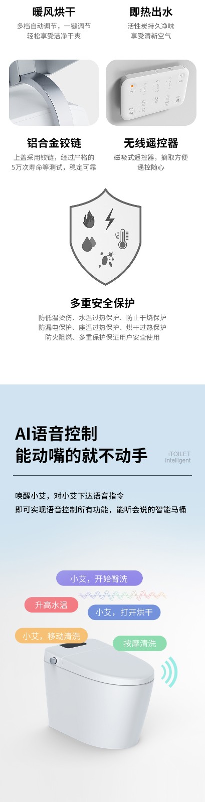 3、主要功能:AI語音控制(可選)、著座感應(yīng)、腳感翻蓋/翻圈/沖刷(可選)、停電(接USB)沖刷、暖風烘干、無線遙控、凈味除臭、